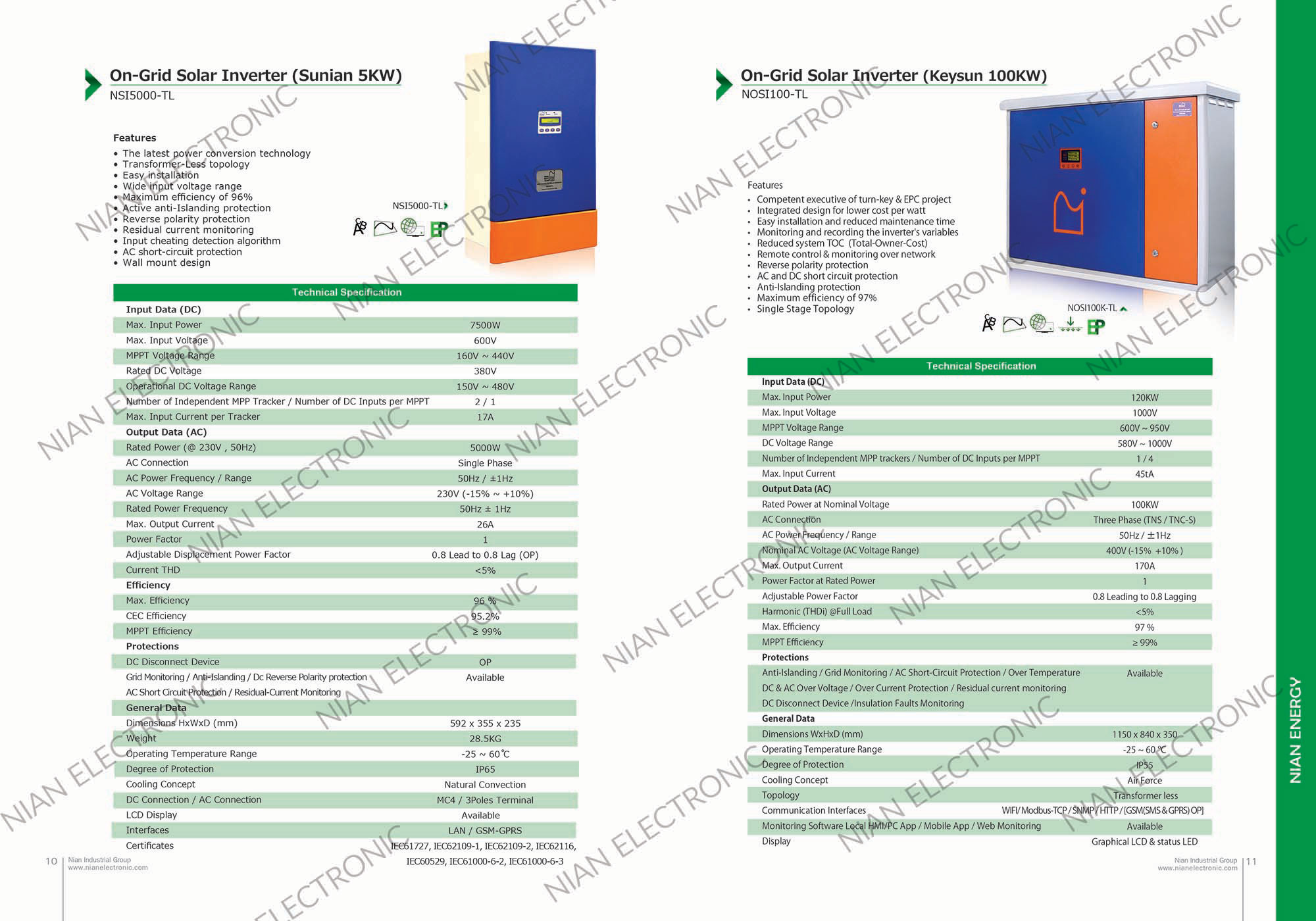 -اينورترهای شركت نيان الكترونيك، از نوع متصل به شبکه و طراحی بدون ترانس بوده، كه مزایایی از قبیل راندمان بالا، وزن و هزینه کمتر را در بر خواهند داشت. همچنين بدليل تنوع كاربرد، از مزايای معماری چند رشته ای (Multi-string)،با قابليت هايی همچون افزايش توليد توان، كاهش هزينه، قابليت اطمينان بالا و كاهش عدم انطباق بين نقطه عملكرد بهينه ماژول فتوولتاييك و اينورتر نيز بهره می برند.