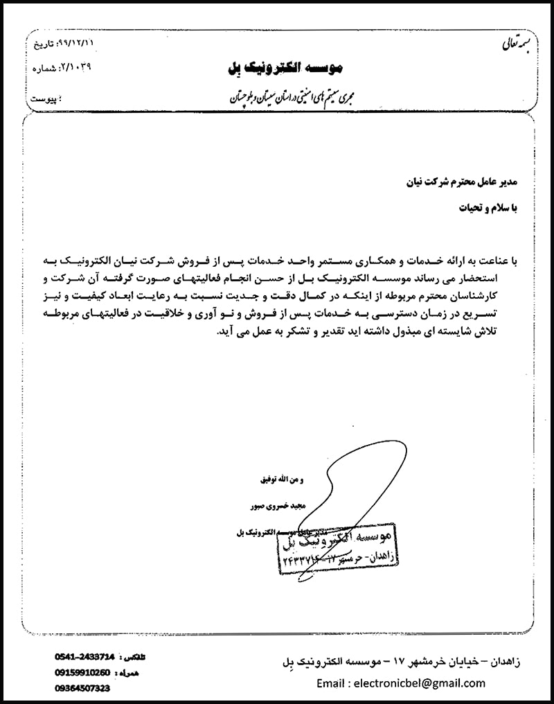 27- تقدیرنامه موسسه الکترونیک بل جهت اعلام رضایتمندی از خدمات پس از فروش - 1399