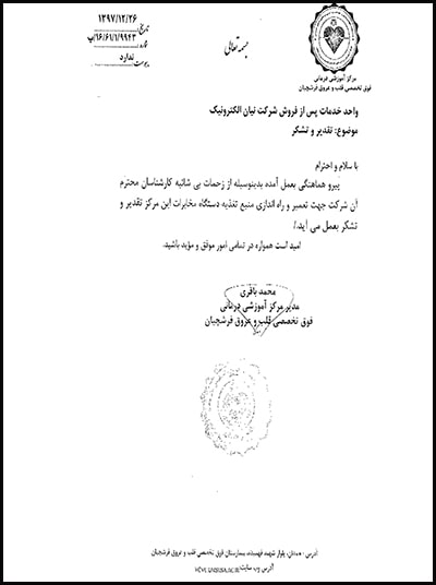36- تقدیرنامه بیمارستان فوق تخصصی قلب و عروق فرشچیان جهت تعمیر و راه اندازی منبع تغذیه دستگاه مخابرات - 1397