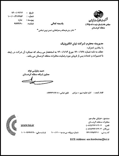 20- تقدیرنامه مخابرات استان کردستان جهت اعلام رضایتمندی از خدمات پس از فروش - 1400